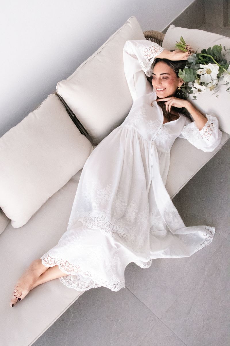 Elaborada en suave algodón blanco, esta bata se distingue por su delicada blonda de encaje en el bajo y las mangas. Presenta un elegante escote en pico y se abrocha hasta la altura de la rodilla con presillas y botones. Sus mangas acampanadas aportan un toque sofisticado, mientras que el corte en la cintura con frunce realza la silueta. Diseñada para llevarse sola, sin necesidad de camisón.