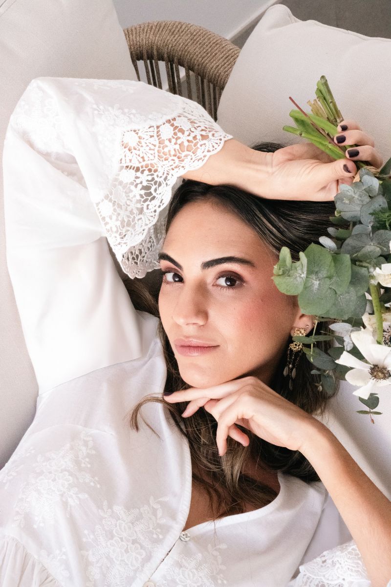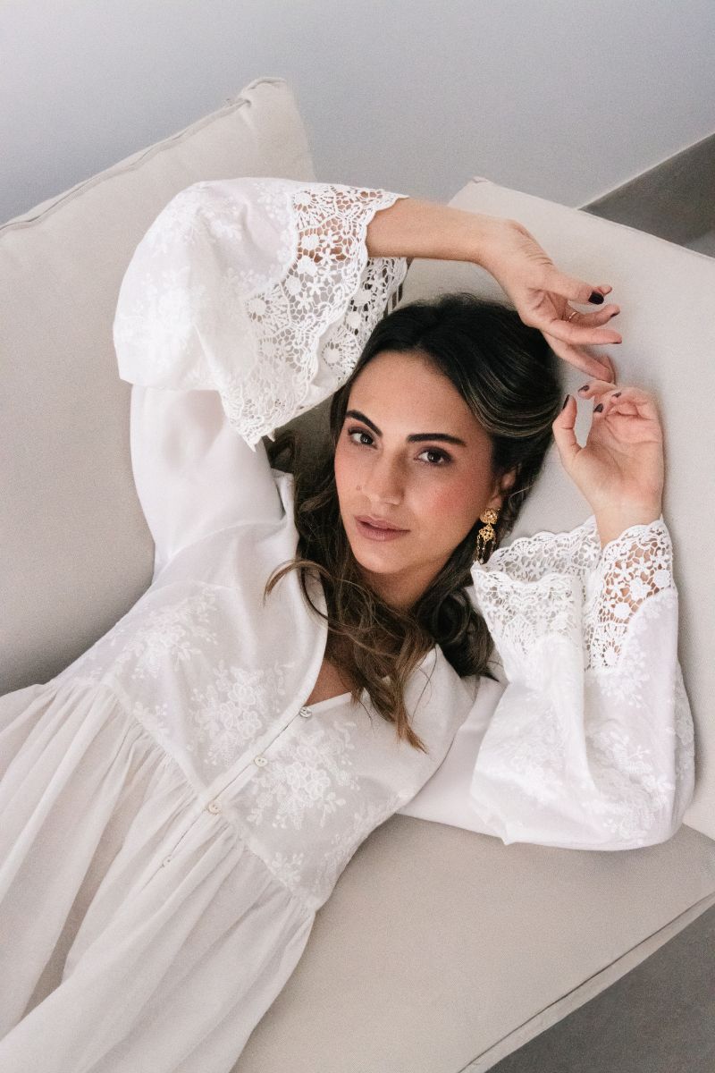 La Bata Suarez, confeccionada en tejido de algodón blanco con una blonda de encaje en el bajo y en las mangas. Escote en forma de pico y abrochada hasta la altura de rodilla con presillas y botones. Mangas con forma acampanada. Corte en cintura con frunce. El diseño de esta bata es para vestirla sola sin camisón.
