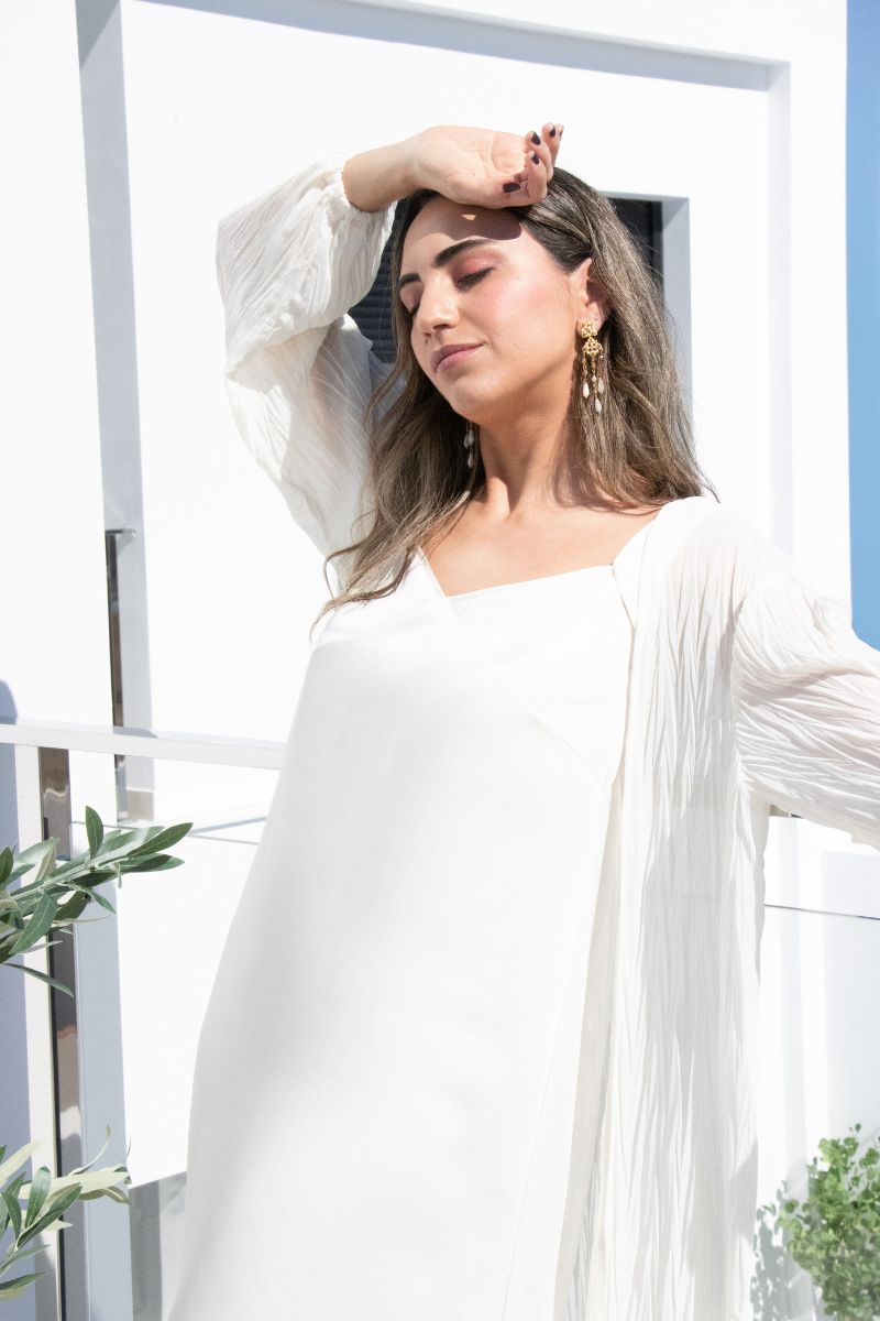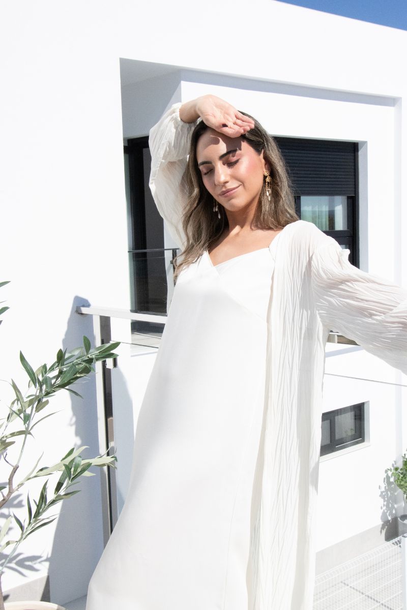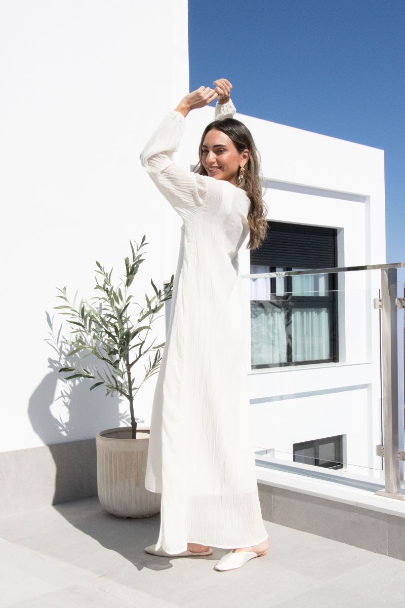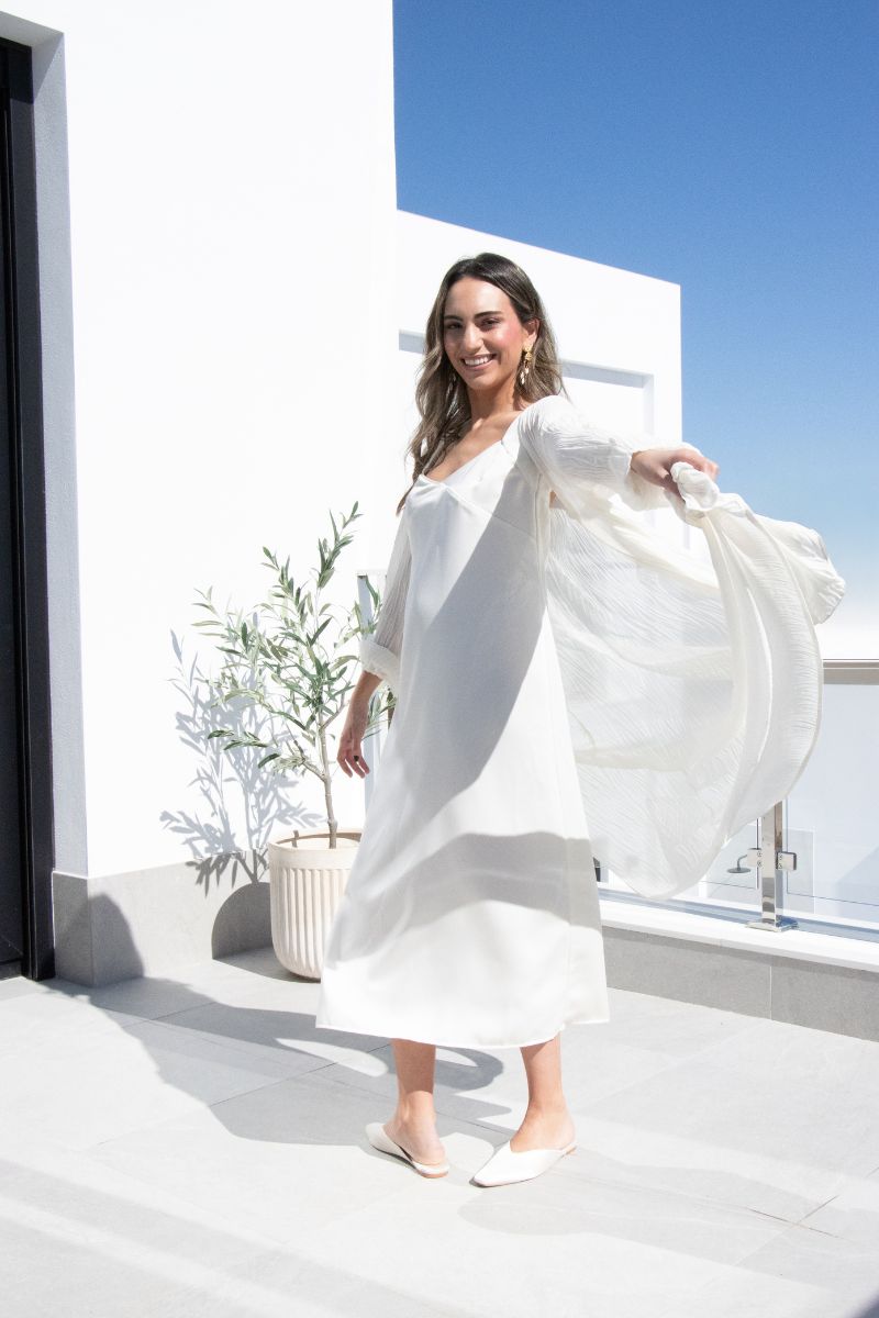 Uno de los aspectos más encantadores de esta prenda es su vuelo, diseñado para moverse con gracia junto al cuerpo. Este detalle no solo resalta la fluidez del tejido, sino que también aporta una sensación de ligereza y libertad, ideal para los momentos íntimos previos o posteriores a la ceremonia. Cada paso, cada giro, cada pequeño gesto se acompaña de un movimiento delicado del camisón, haciendo que la novia luzca etérea y soñadora.