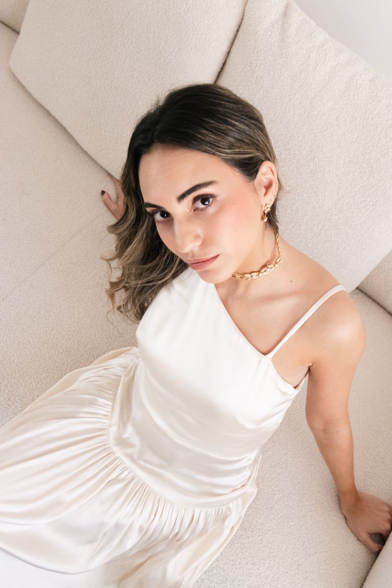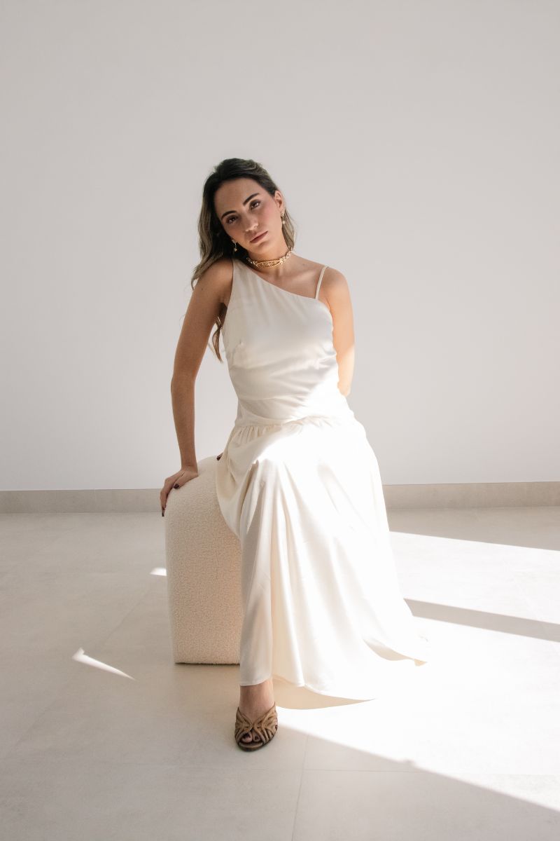 El escote asimétrico en el Camisón Romero aporta un aire moderno y sofisticado, que rompe con lo tradicional sin perder la esencia romántica. El corte en la cintura y la cadera define la silueta con sutileza, mientras que el frunce añade movimiento y suavidad a cada paso.