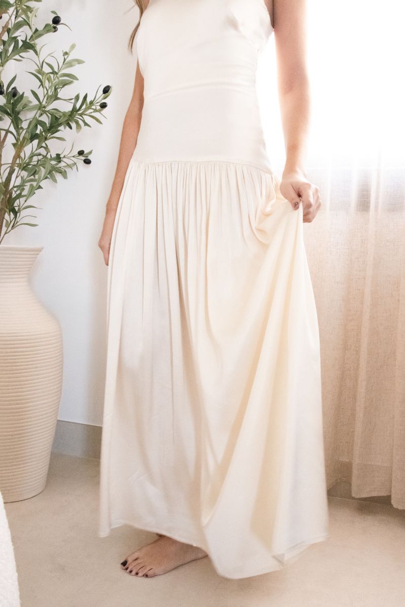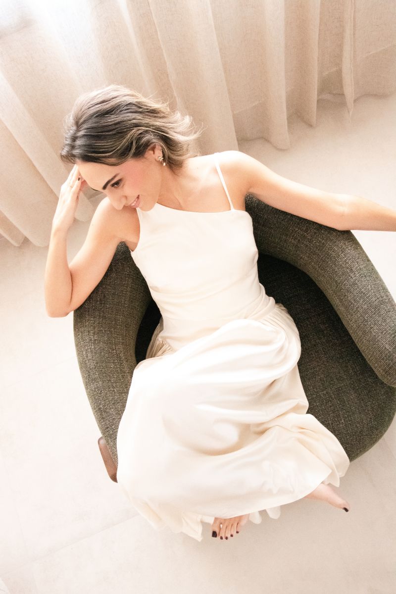 El satén, con su leve brillo, envuelve el cuerpo como una caricia, aportando una sensación de lujo y ligereza. La abertura en la espalda, con sus delicadas presillas y botones forrados a mano, crea un juego visual muy femenino que deja ver solo lo justo, logrando un equilibrio entre sensualidad y elegancia.