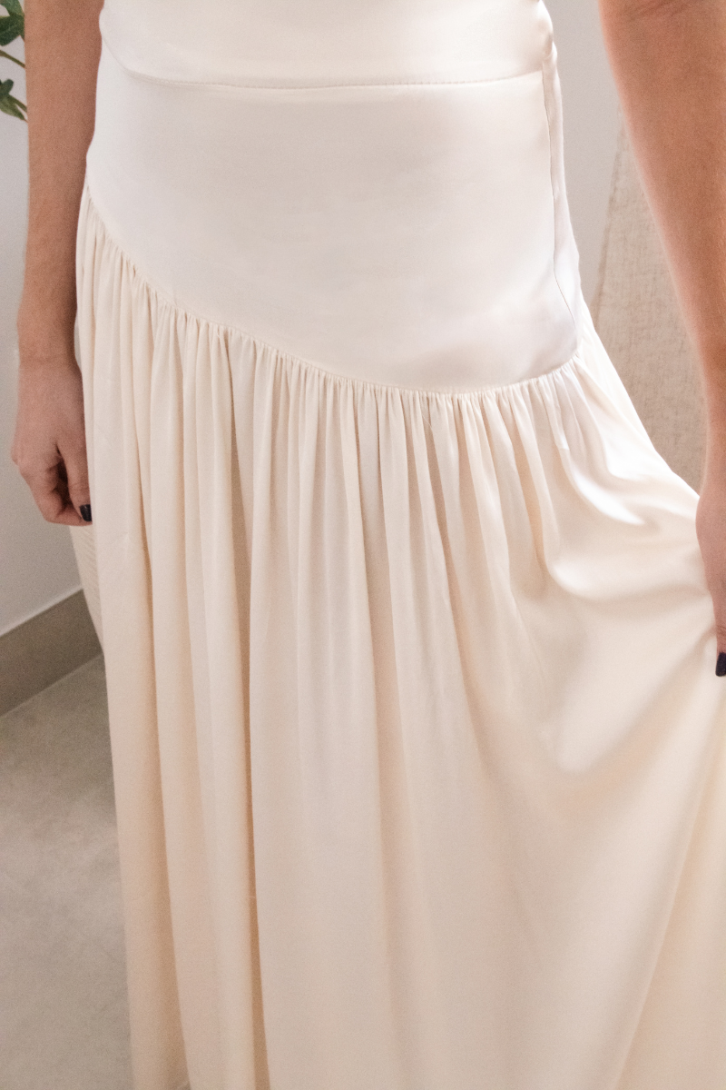 Confeccionado en satén con un pequeño toque satinado. Escote asimétrico. Corte en cintura y cadera acompañado de frunce. Abertura en la espalda con presillas y botones.
