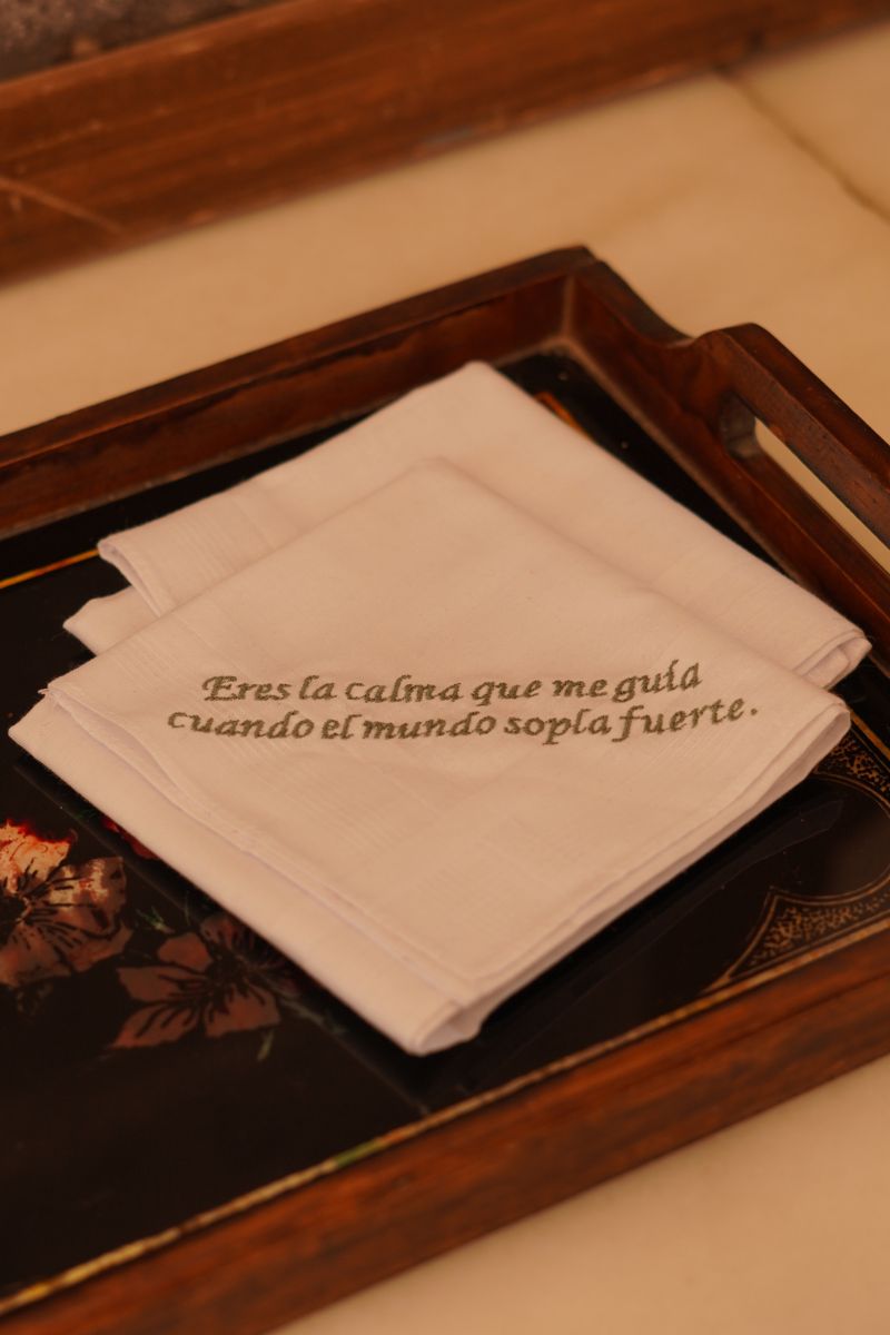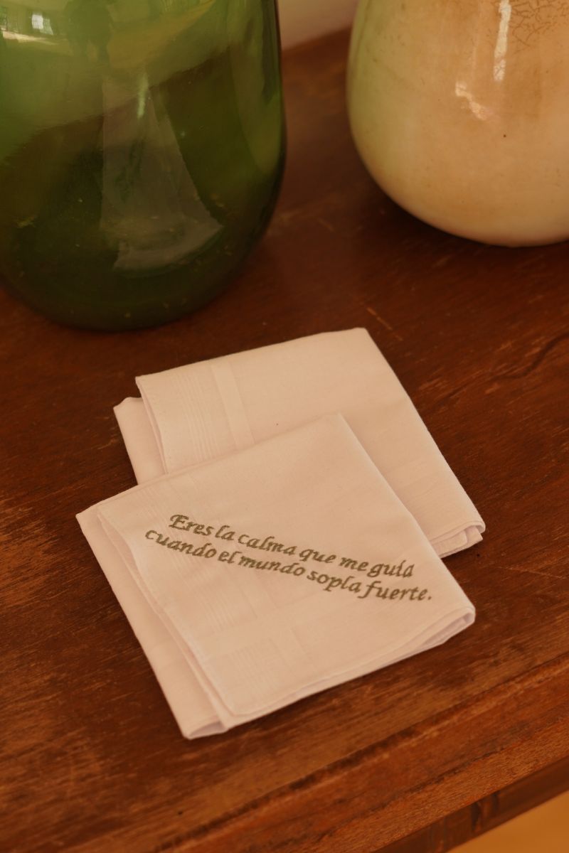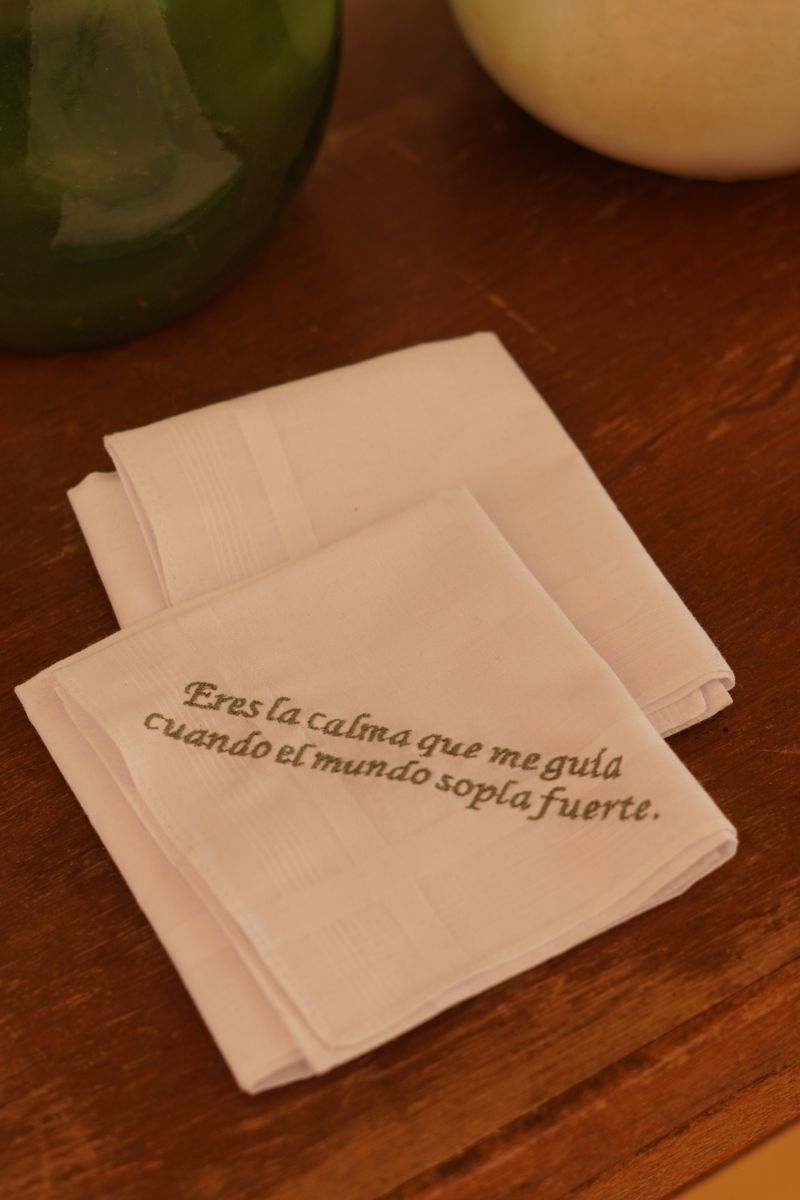 Nuestro Pañuelo Bordado con frase es un pañuelo clásico blanco bordado con letra en color verde. Un detalle especial para esa persona elegida en el día más bonito de nuestra vida. Bordamos cualquier frase en el color que se quiera. Es un regalo de lo más especial tanto como para el día de la boda como para las ceremonias previas como la pedida donde puedes sorprender a tu prometido, a tu padre o a los testigos con este detalle tan especial.